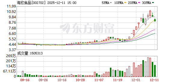 海欣食品今日跌停,全天换手率32.81%,成交额13.68亿元,振幅7.25%。龙虎榜数据显示,营业部席位合计净买入429.63万元。