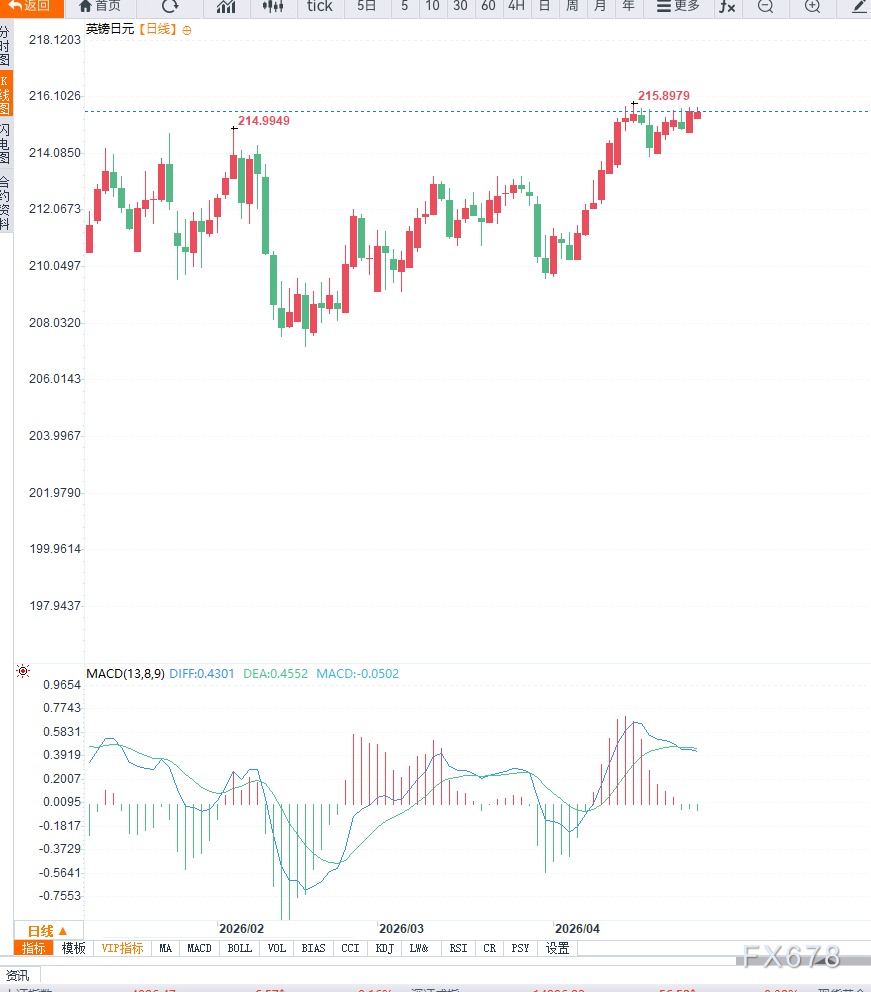 从技术面来看,日线级别上,GBP/JPY维持高位运行格局,整体趋势仍偏多,价格沿上升通道运行,但短期动能有所放缓。当前关键支撑位位于213.80附近,若跌破可能回落至212.50区域;上方阻力位集中在216.50至218.00区间,该区域为前期高点附近压力区。动能指标显示多头仍占主导,但上涨斜率趋缓。4小时级别来看,汇价呈现震荡上行结构,短期均线维持多头排列,但多次冲高未能有效突破216.00上方,表明上方存在较强抛压。若后续突破216.50,则有望打开进一步上行空间;反之,若跌破213.80,则可能进入阶段性调整。