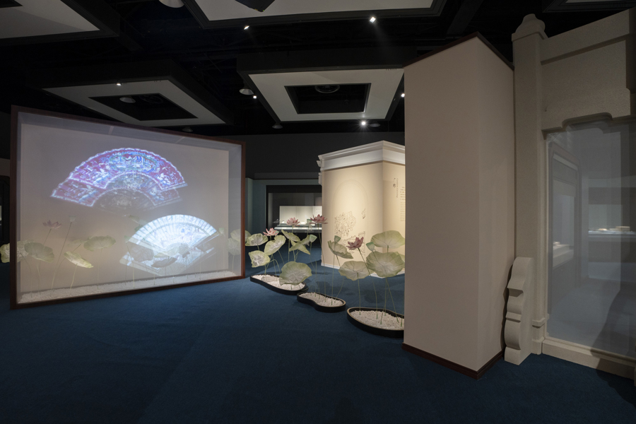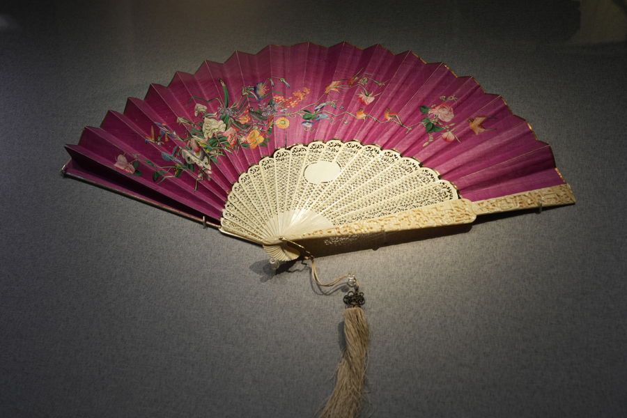 值得一提的是,当年的不少外销艺术不仅成为全球潮流单品,还在欧美社交中发挥着重要的作用。集铸造、雕刻、镶嵌、绘画等多种艺术于一身的名片盒,就是其中的代表。十多只外销名片盒汇聚在此次展览,各美其美。其中一只银累丝缠枝西番莲纹名片盒尤为风雅,银累丝材质,长方花瓣形,通体以粗银丝做骨架,以连珠状细银丝累出郁金香花形。欧洲社交文化中,外销折扇逐渐发展出的一套“扇语”,以开合、遮掩、摇动等动作传递情感暗号,也让这类艺术超越了实用功能,成为承载情感与礼仪的社交器物。