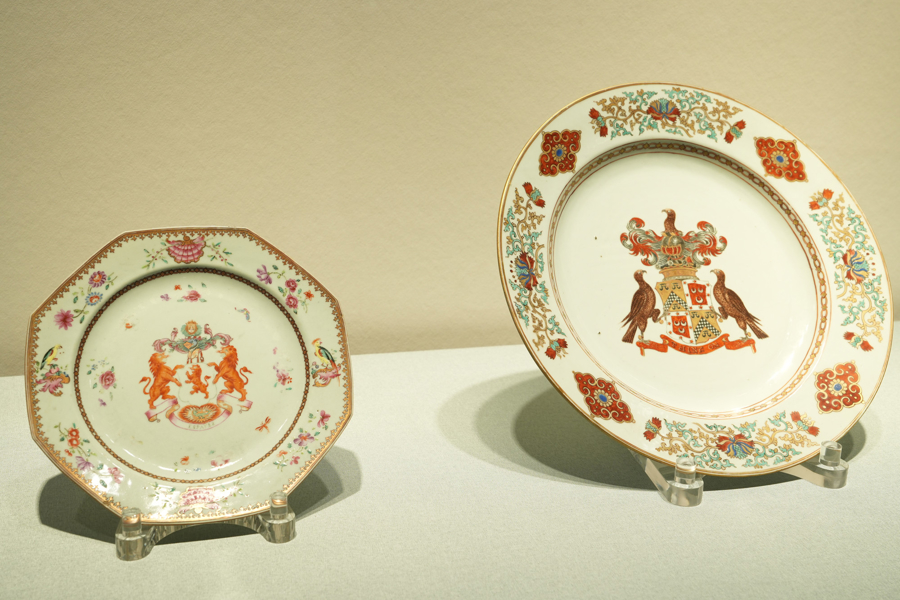 当年的众多外销艺术尽显创新意识,在展览中,观众得缘借由实物展品一睹其“中西合璧、异趣共生”的独特风采。例如,广绣吸收西洋油画明暗透视原理,在欧美社会大受欢迎。此次展出的一件白缎广绣花束纹披肩,展开竟有三四平米之大,可见立体感十足的飘带花卉、缠枝花卉、蔓草花卉纹样等。18世纪中后期,这样的中国外销披风风靡欧美,每年出口高达八万多条,其中法国占了四分之一。广彩则将景德镇白瓷与西方审美巧妙加以结合,既保留中国传统彩绘技艺,又融入欧洲家族徽章、西方神话故事等题材,成为中西文化交流的鲜活见证。现身展览的一只偌大的广彩徽章纹大盘,板沿处以四组缠枝西番莲与菱形花卉间隔为饰,内圈饰金彩锦地纹一周,盘心绘英国罗斯伯爵家族徽章,诉说着欧洲贵族定制中国瓷器的跨洋情谊。这类徽章瓷由于订制时费用高、要求严,从瓷质到彩绘大多十分精美,主要用于出口,明确的订烧信息为研究彼时的中外贸易交流提供了重要的实物资料。