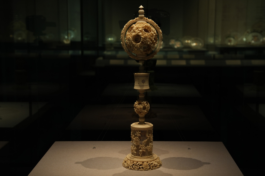 独享“单间”展柜待遇的一件象牙雕多层鬼工球摆件精巧至极,则牵起外销艺术的世博因缘。“鬼工球”即套球,又称“同心球”,取鬼斧神工之意,是广州最具代表性的牙雕制品。在1915年美国旧金山世博会上,广州牙雕艺人翁昭正是凭借一件26层镂空透雕象牙鬼工球获得金奖。此次展出的这件鬼工球,柱首顶端素身圆雕塔形钮下连着高浮雕缠枝牡丹圆环,内套16层“鬼工球”一枚,外壁饰高浮雕牡丹花卉,内层牙球镂通雕菱格纹、花瓣纹,每层均镂12圆孔,层层可转。柱身光素,下部还饰有小鬼工球一枚,纹饰与大球同,套9层镂12孔。